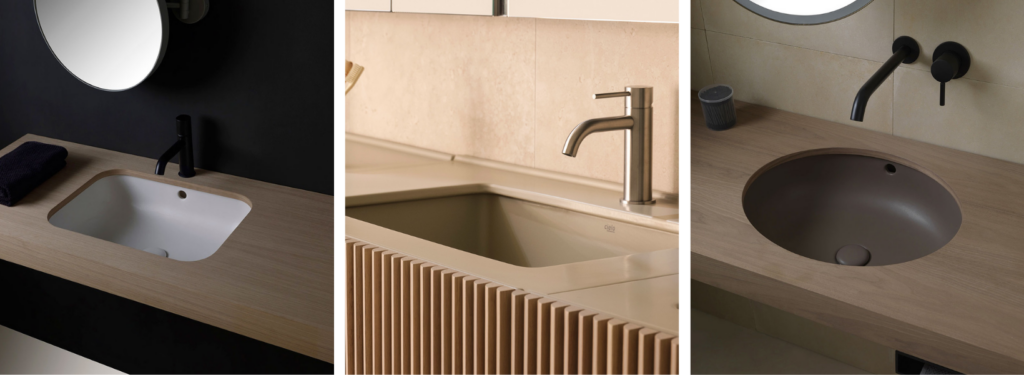 Il lavabo da incasso sottopiano viene installato al di sotto del top, lasciando la superficie del piano completamente libera da ingombri visivi.