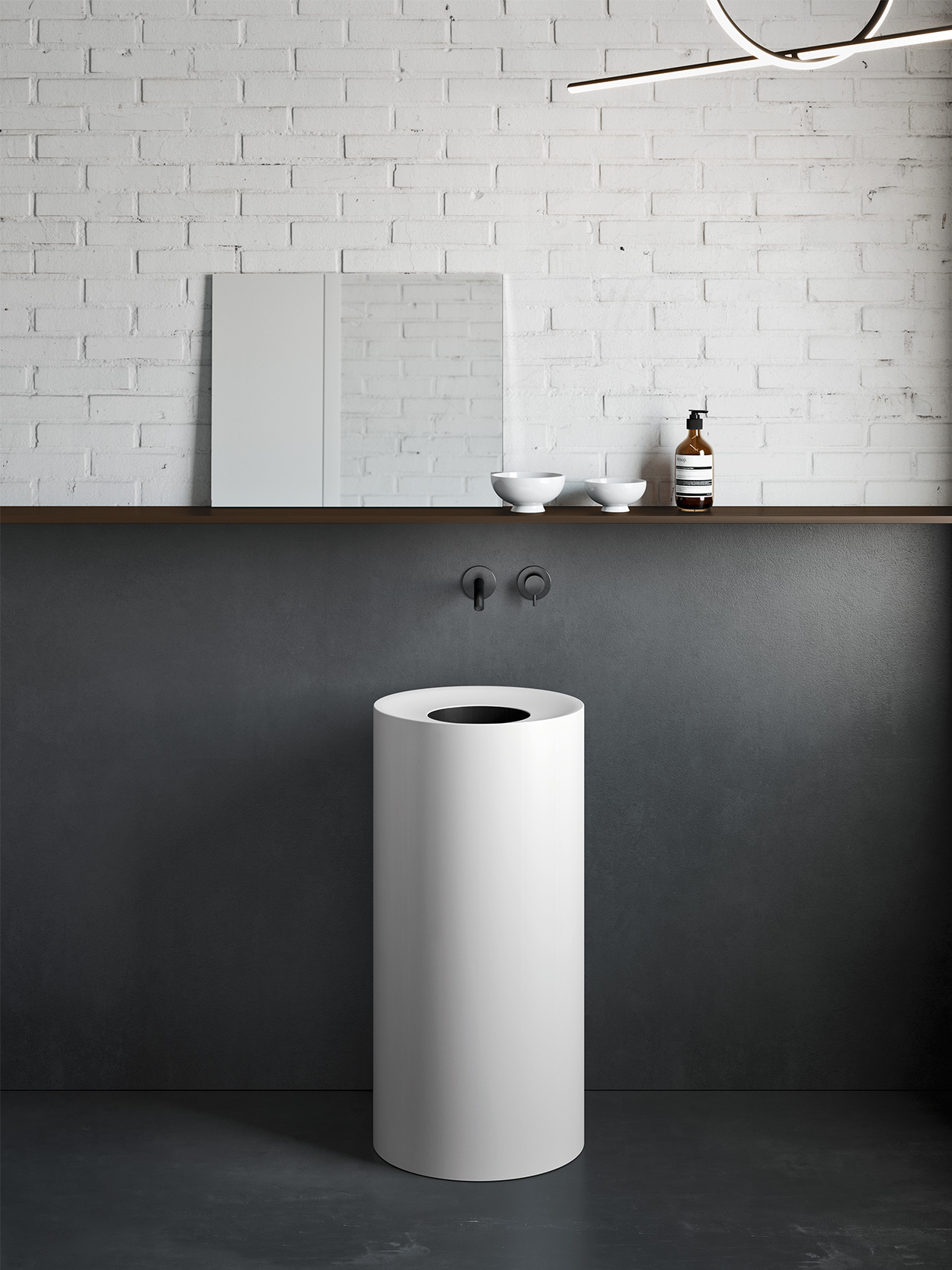 Ispirato al tradizionale lavabo a colonna, viene reinterpretato in chiave moderna attraverso forme scultoree e scenografiche.