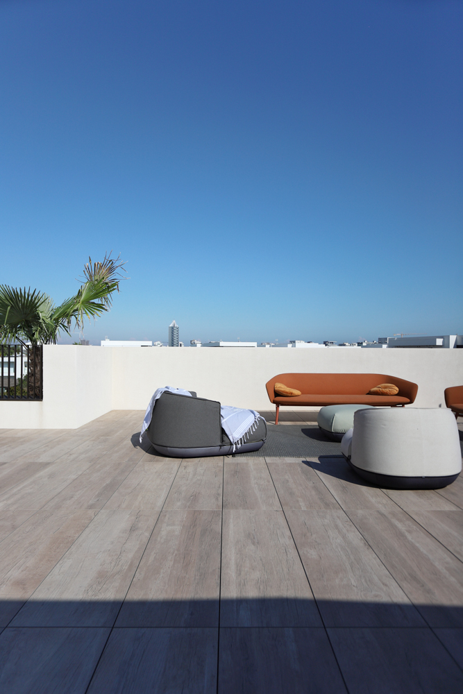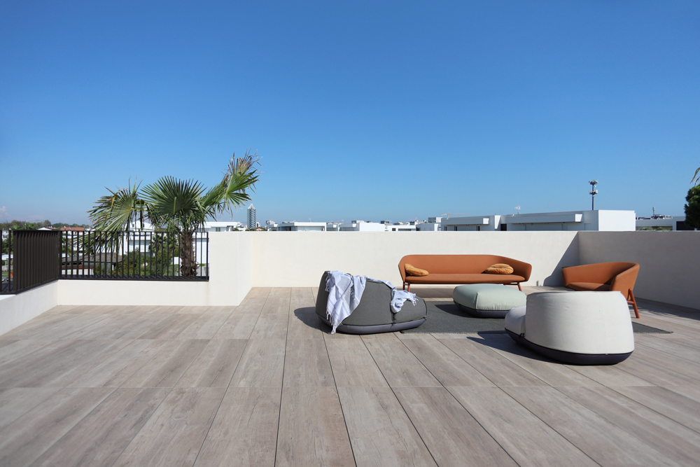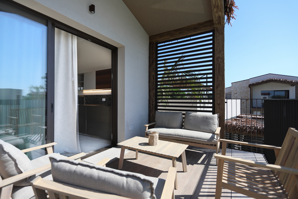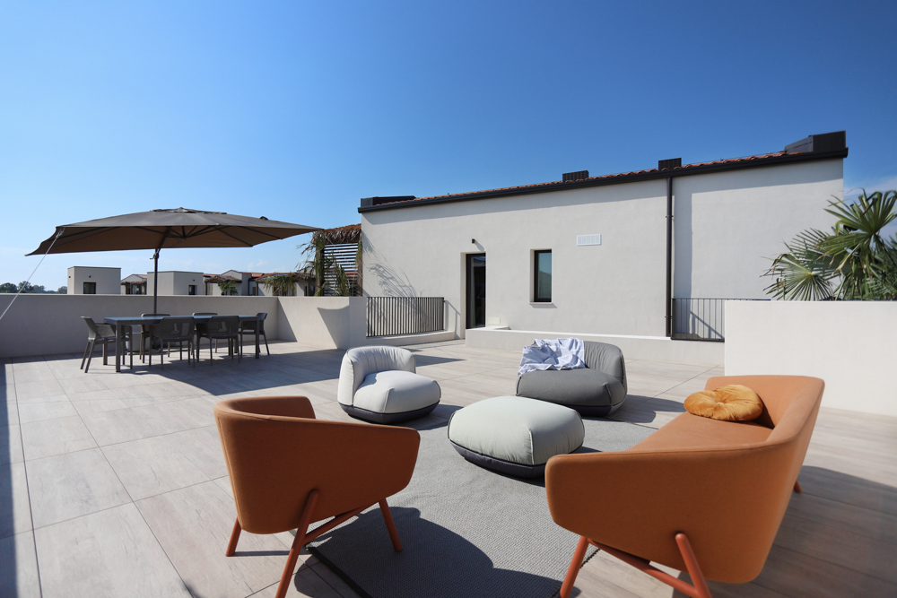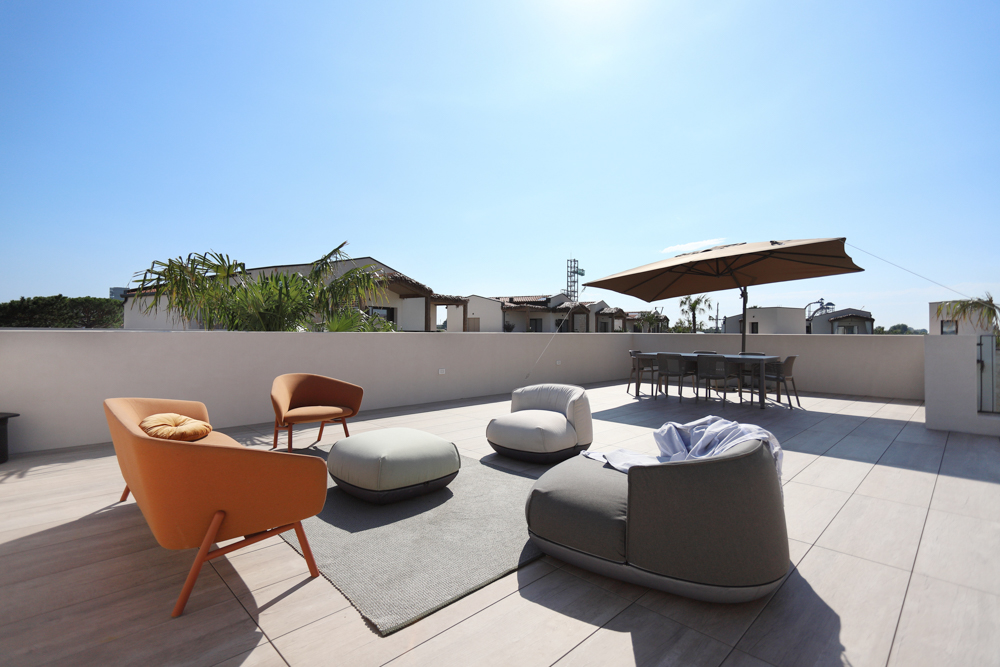 Gli esterni sono stati arredati con salottino Kristalia e tavolo con sedie Nardi, una combinazione pensata per creare uno spazio all’aperto perfetto per rilassarsi e godersi le serate estive all’aperto.