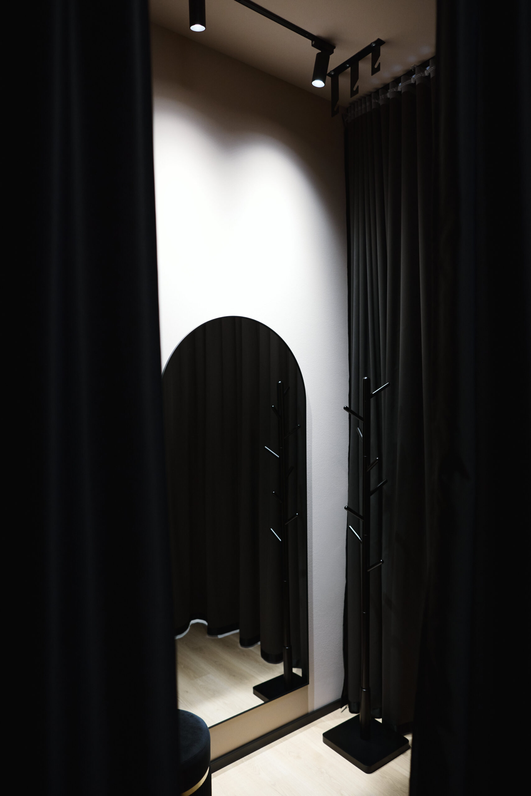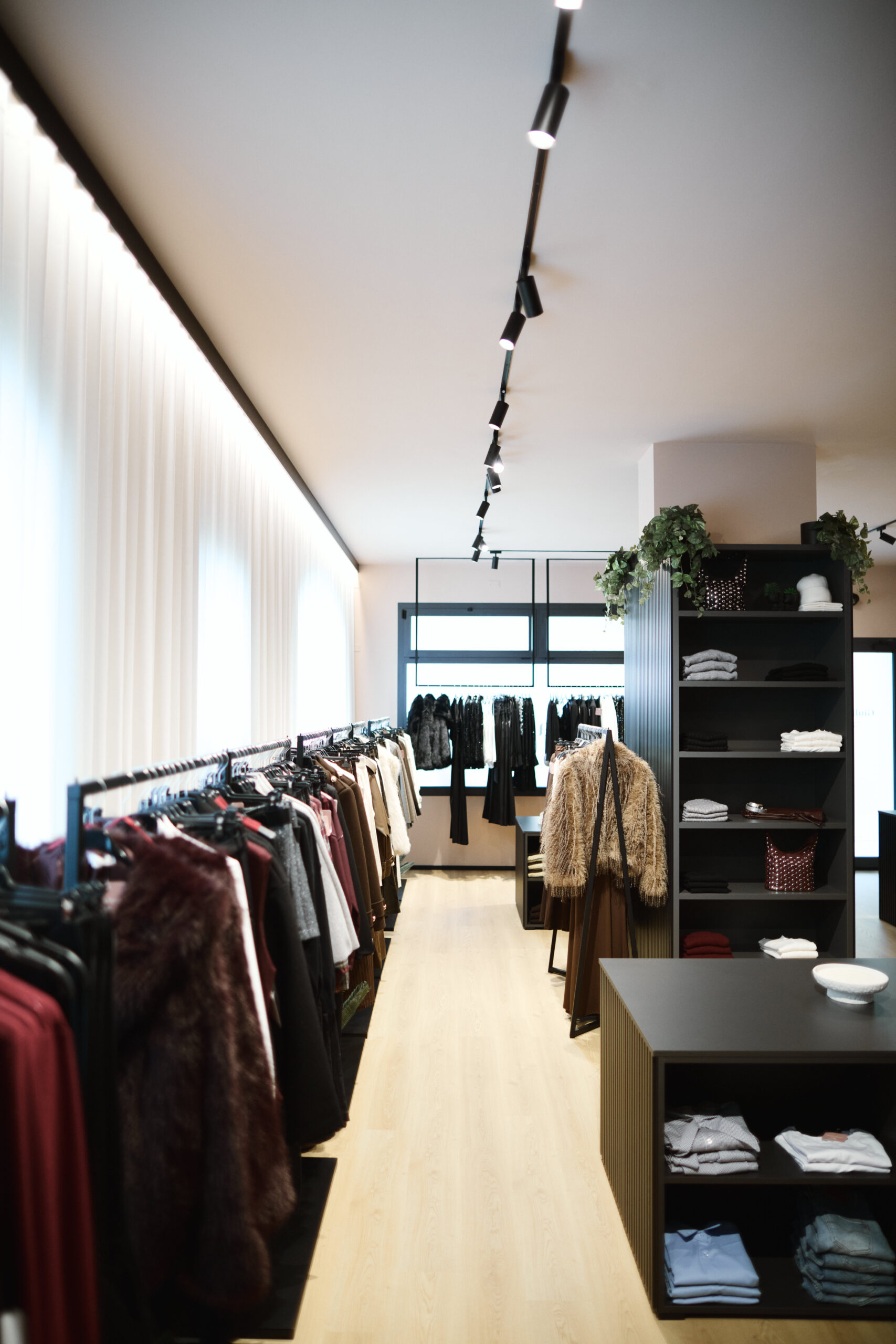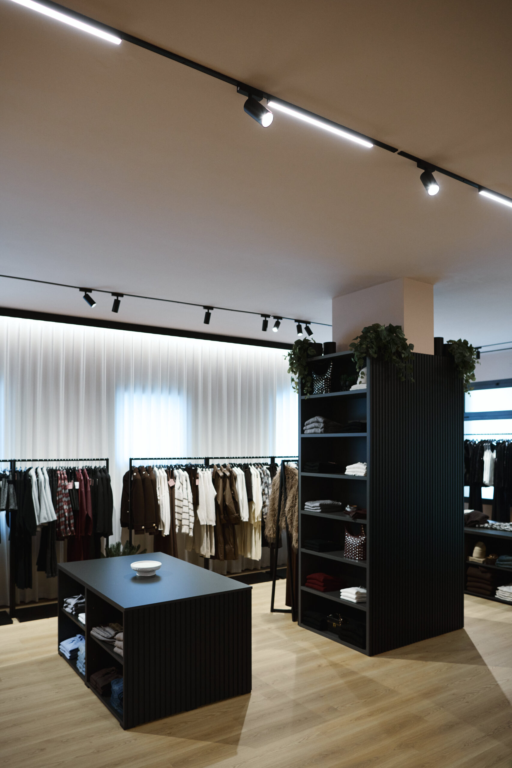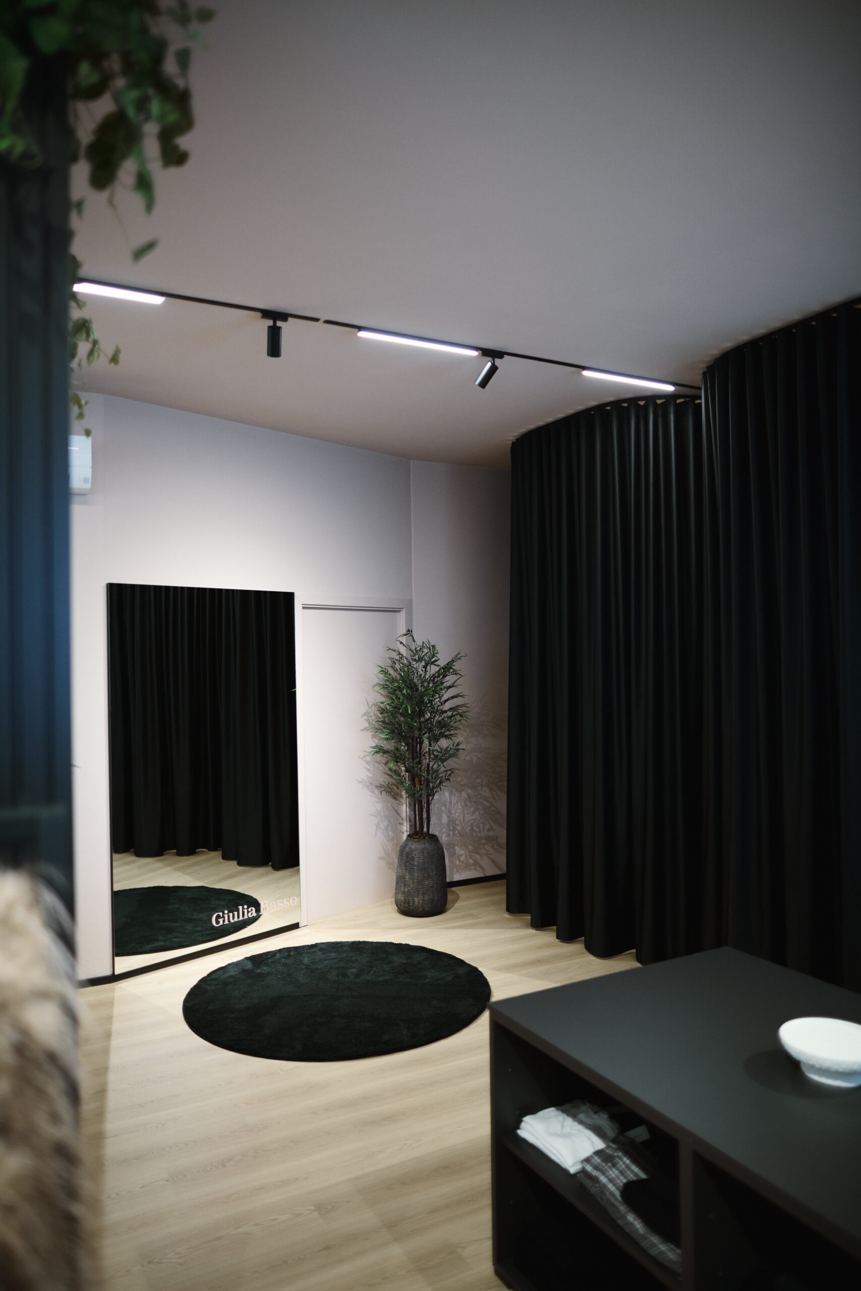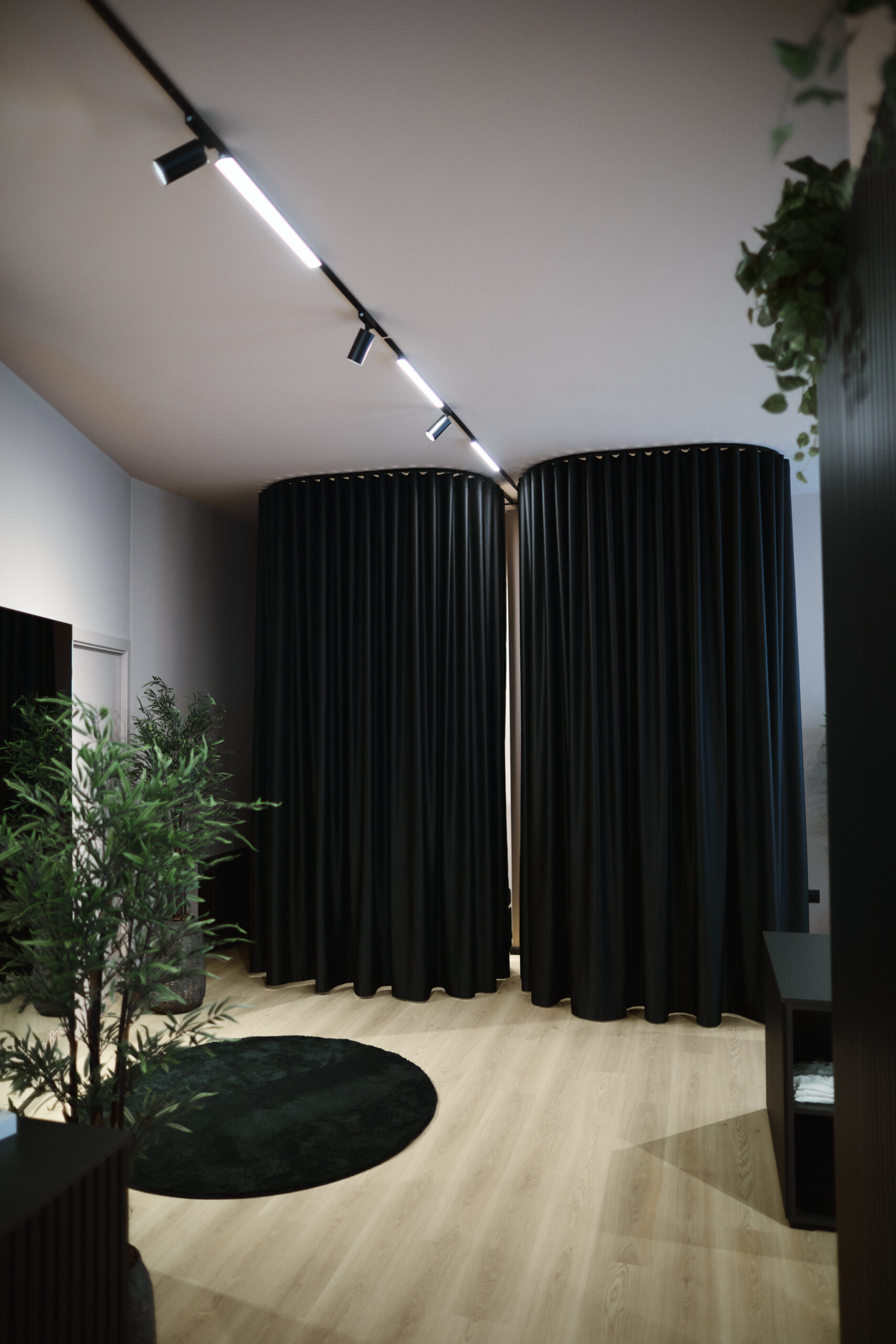 I camerini sono stati realizzati utilizzando tende custom con sviluppo tondeggiante, progettate per creare un effetto morbido e avvolgente. La tenda principale installata sulle vetrate svolge una doppia funzione: garantire la schermatura e costruire impatto dall’esterno, aumentando l’attrattività del negozio. Per il progetto illuminotecnico sono state inserite strip LED sopra i camerini per una luce uniforme e valorizzante, insieme a un sistema di illuminazione a binario interno che consente grande flessibilità nella gestione delle zone espositive.