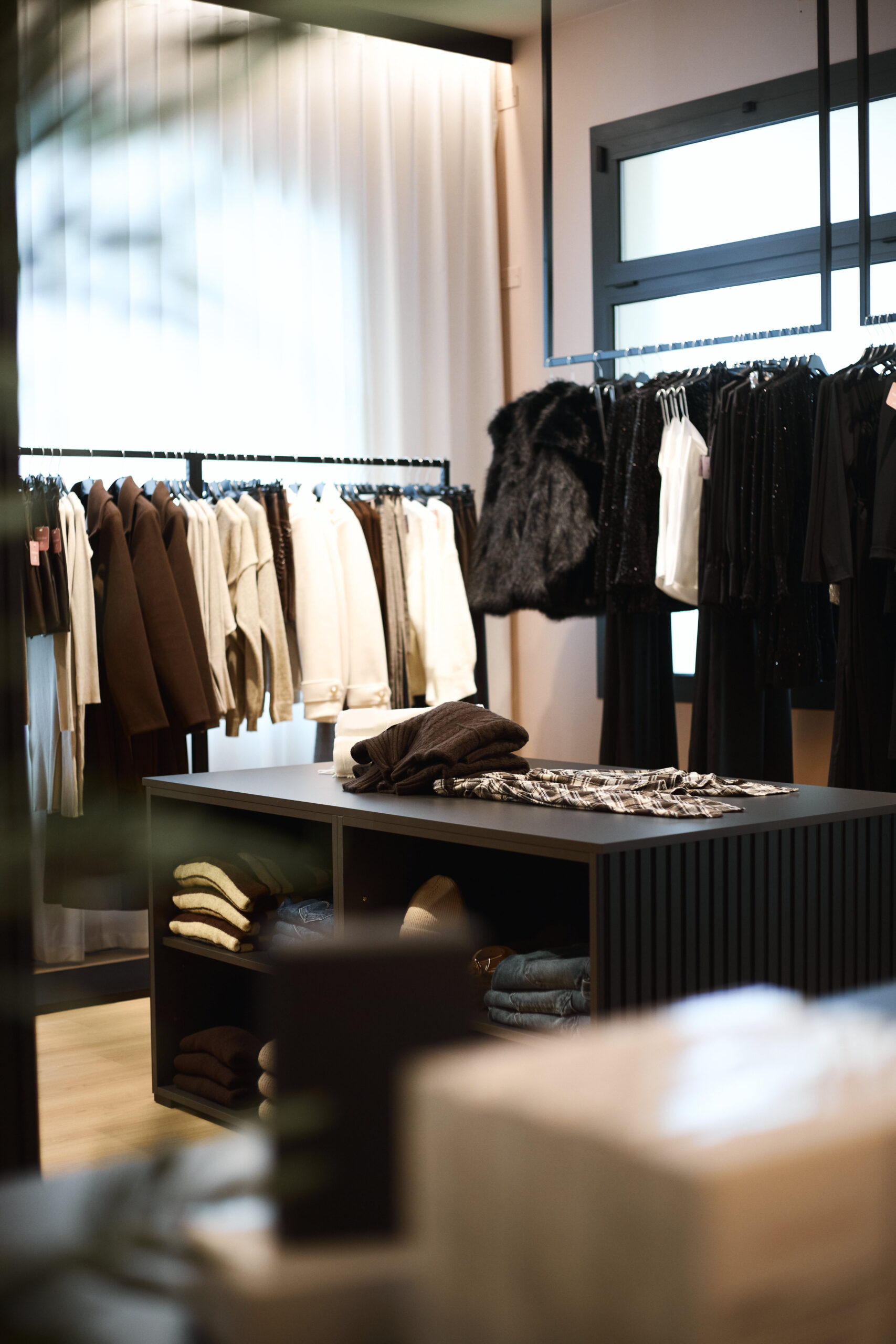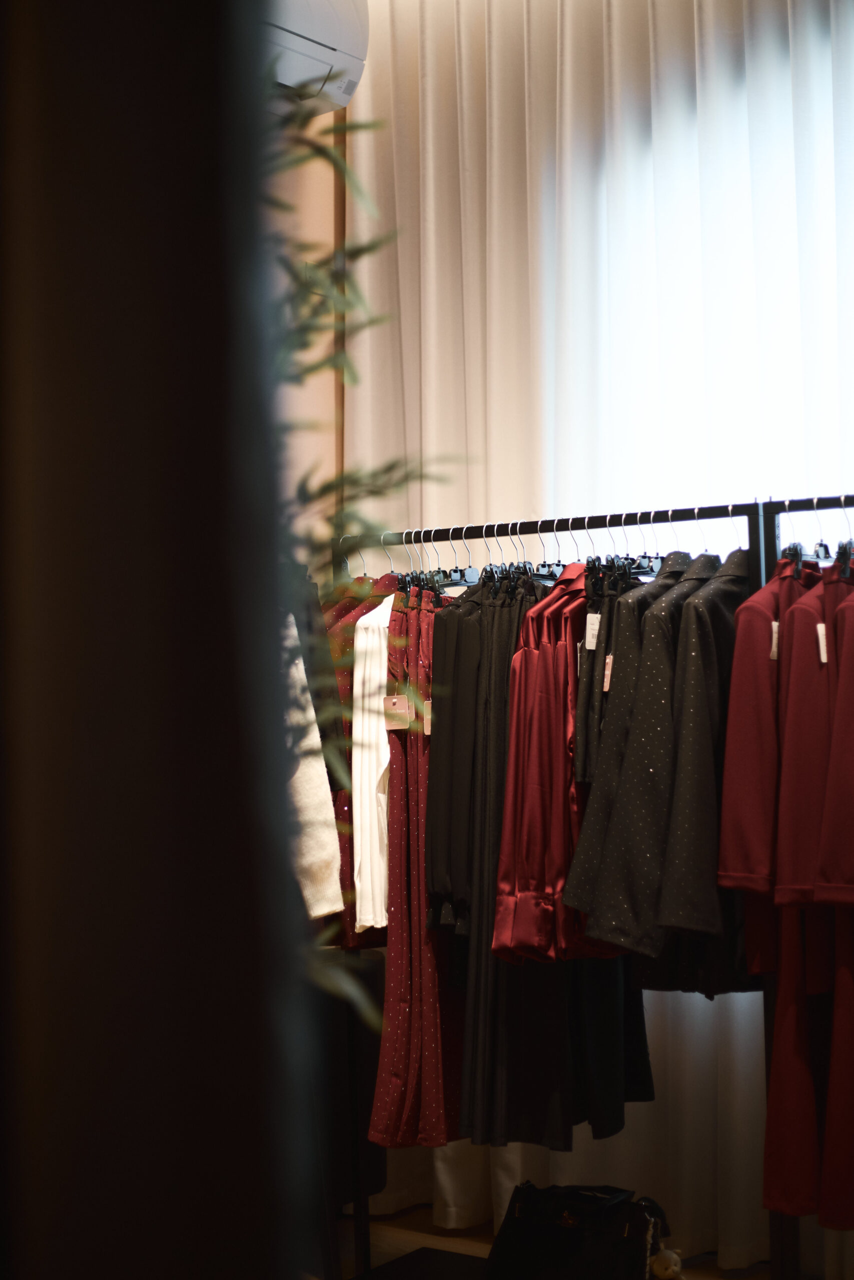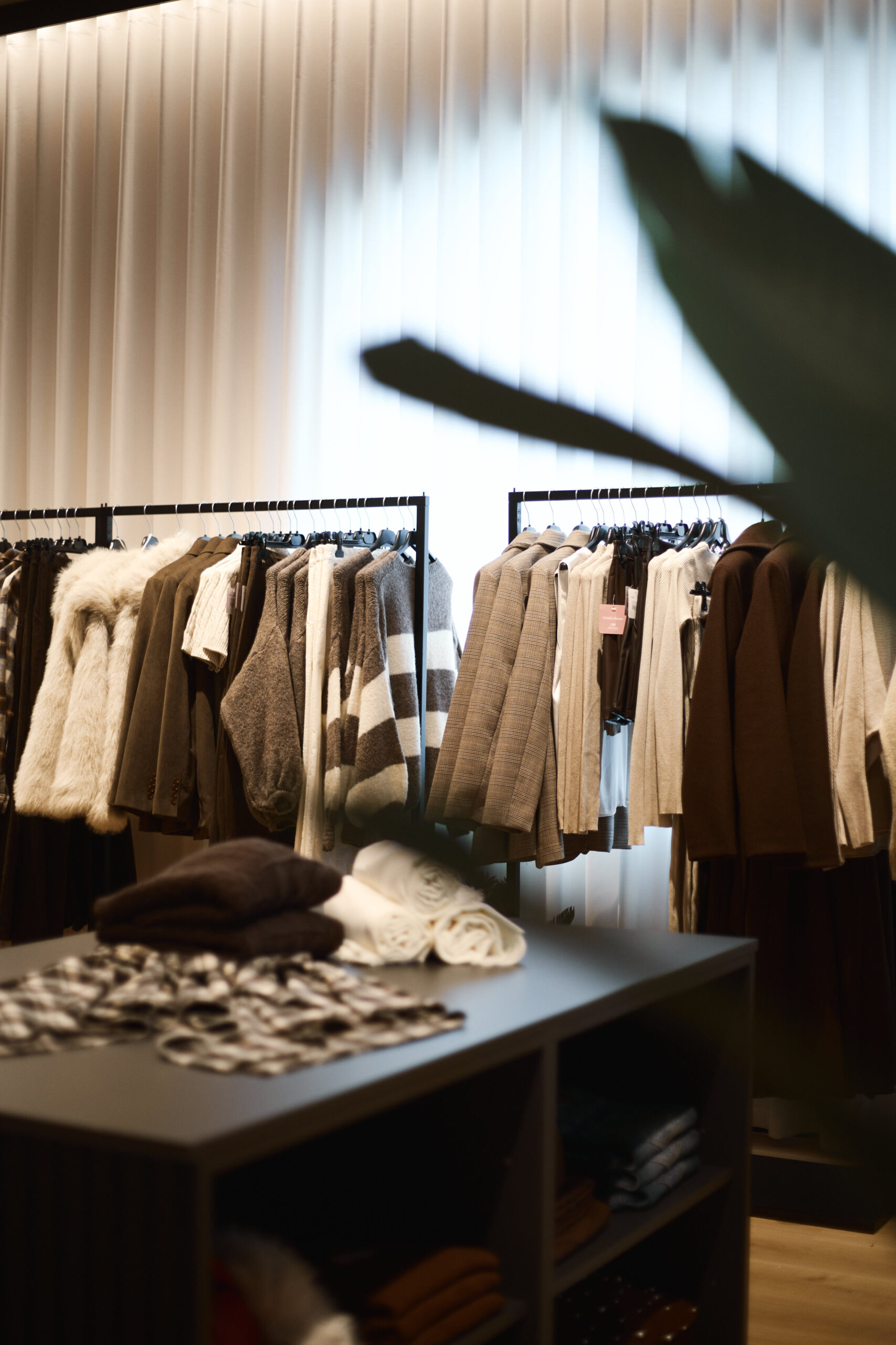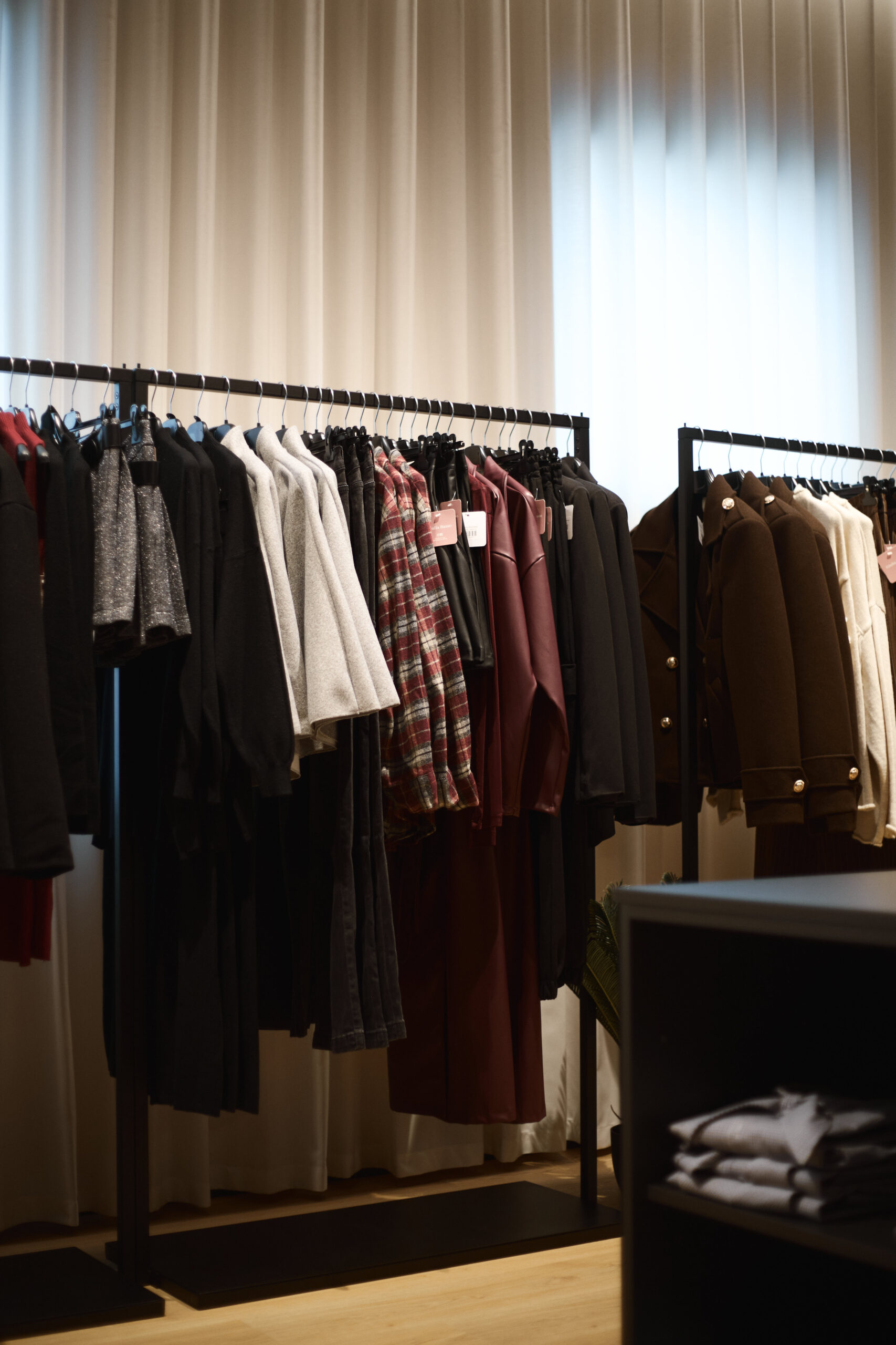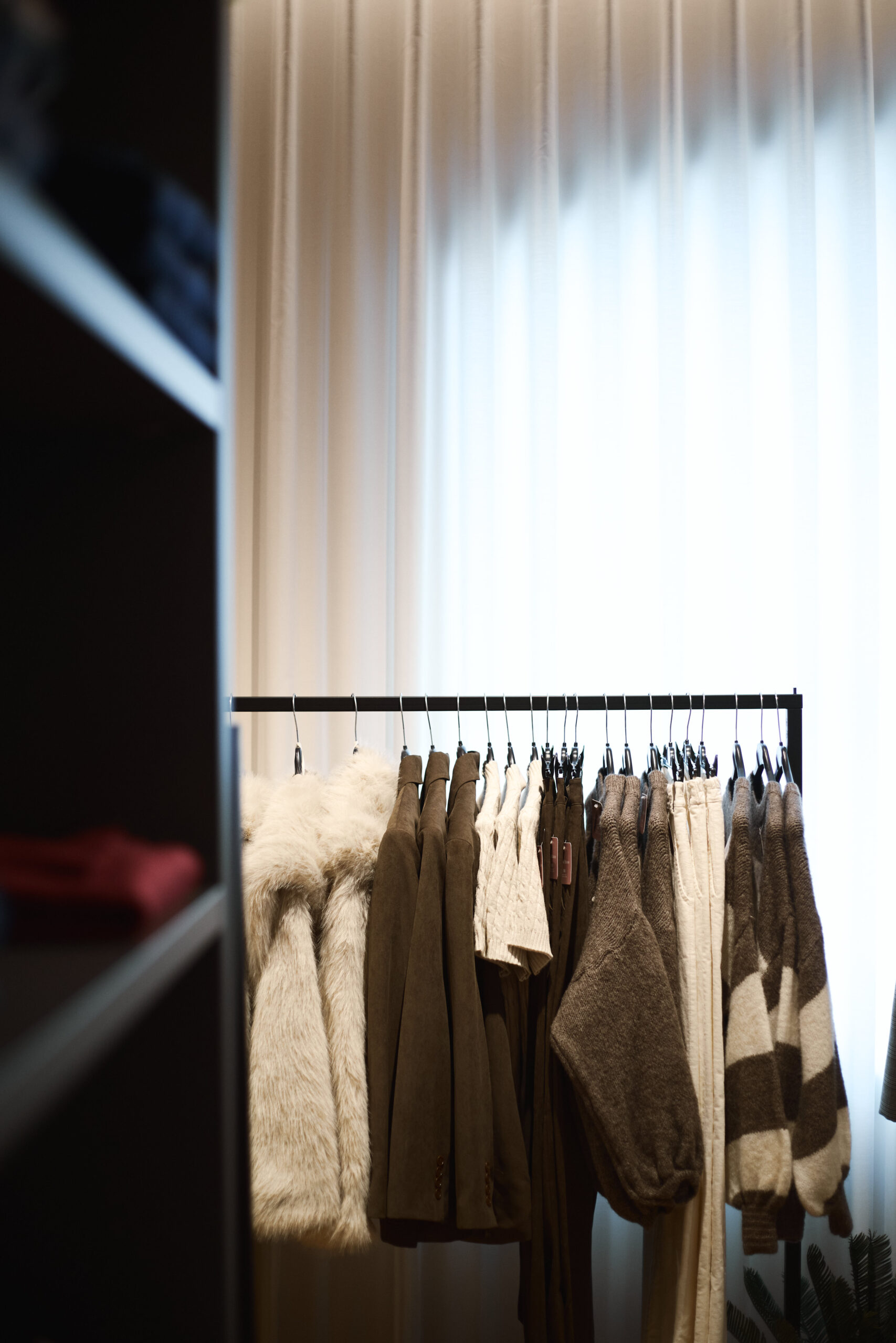 I camerini sono stati realizzati utilizzando tende custom con sviluppo tondeggiante, progettate per creare un effetto morbido e avvolgente. La tenda principale installata sulle vetrate svolge una doppia funzione: garantire la schermatura e costruire impatto dall’esterno, aumentando l’attrattività del negozio. Per il progetto illuminotecnico sono state inserite strip LED sopra i camerini per una luce uniforme e valorizzante, insieme a un sistema di illuminazione a binario interno che consente grande flessibilità nella gestione delle zone espositive.