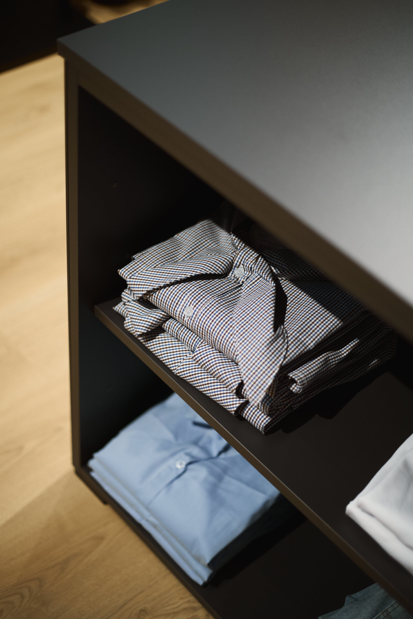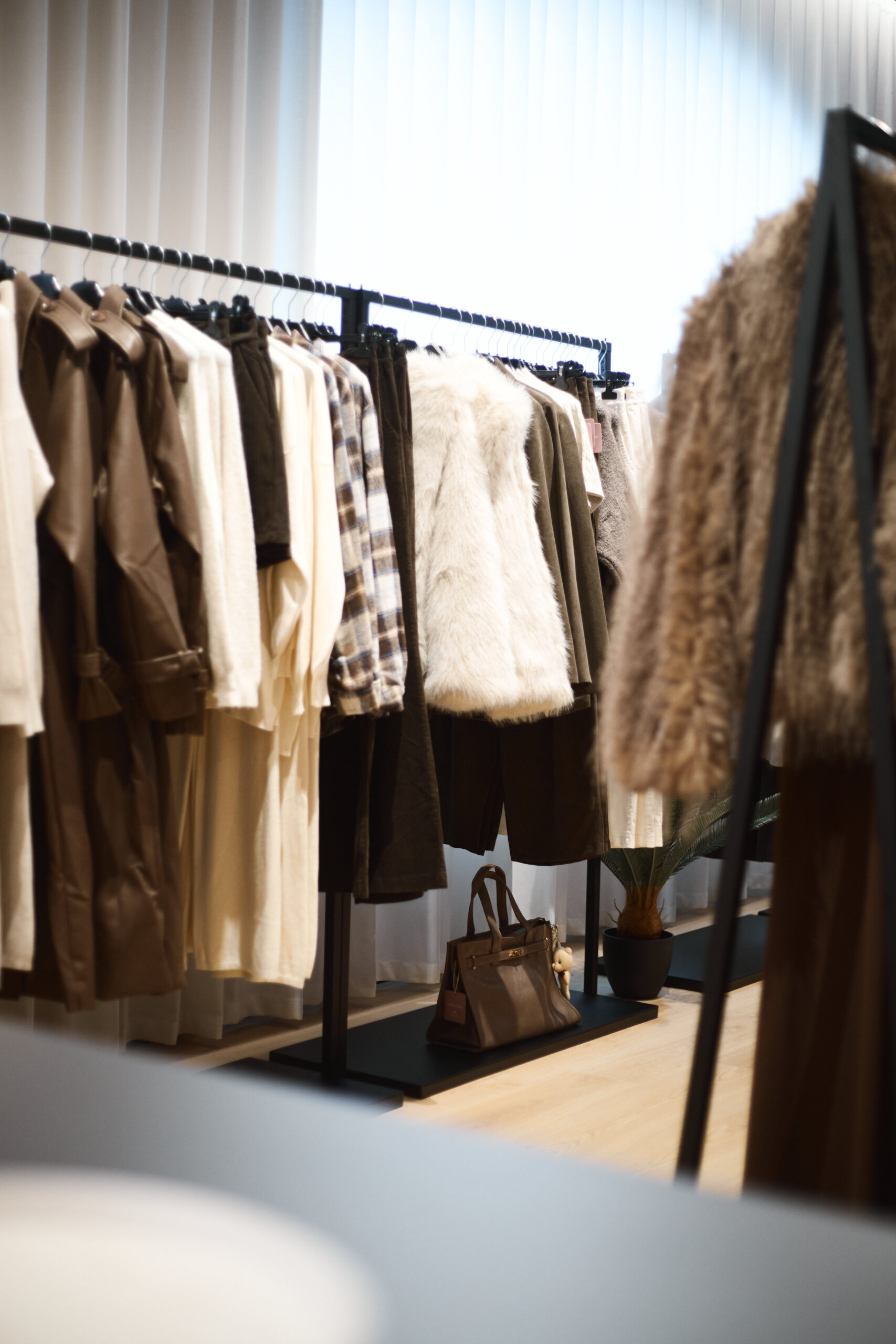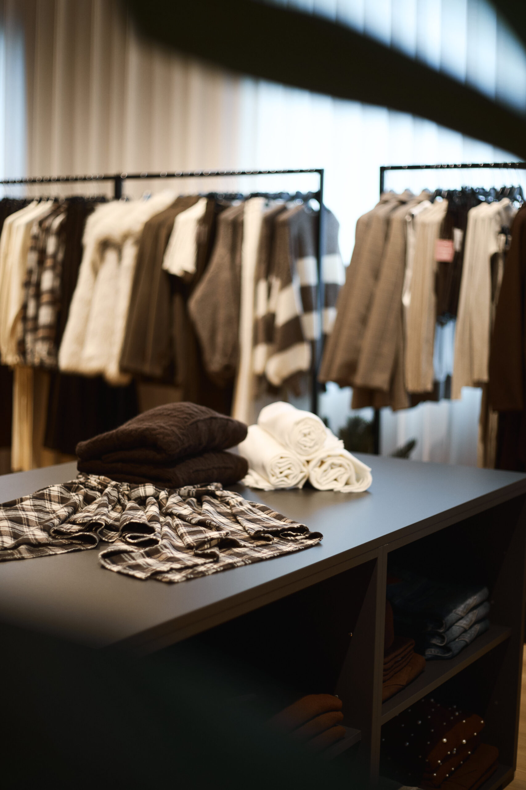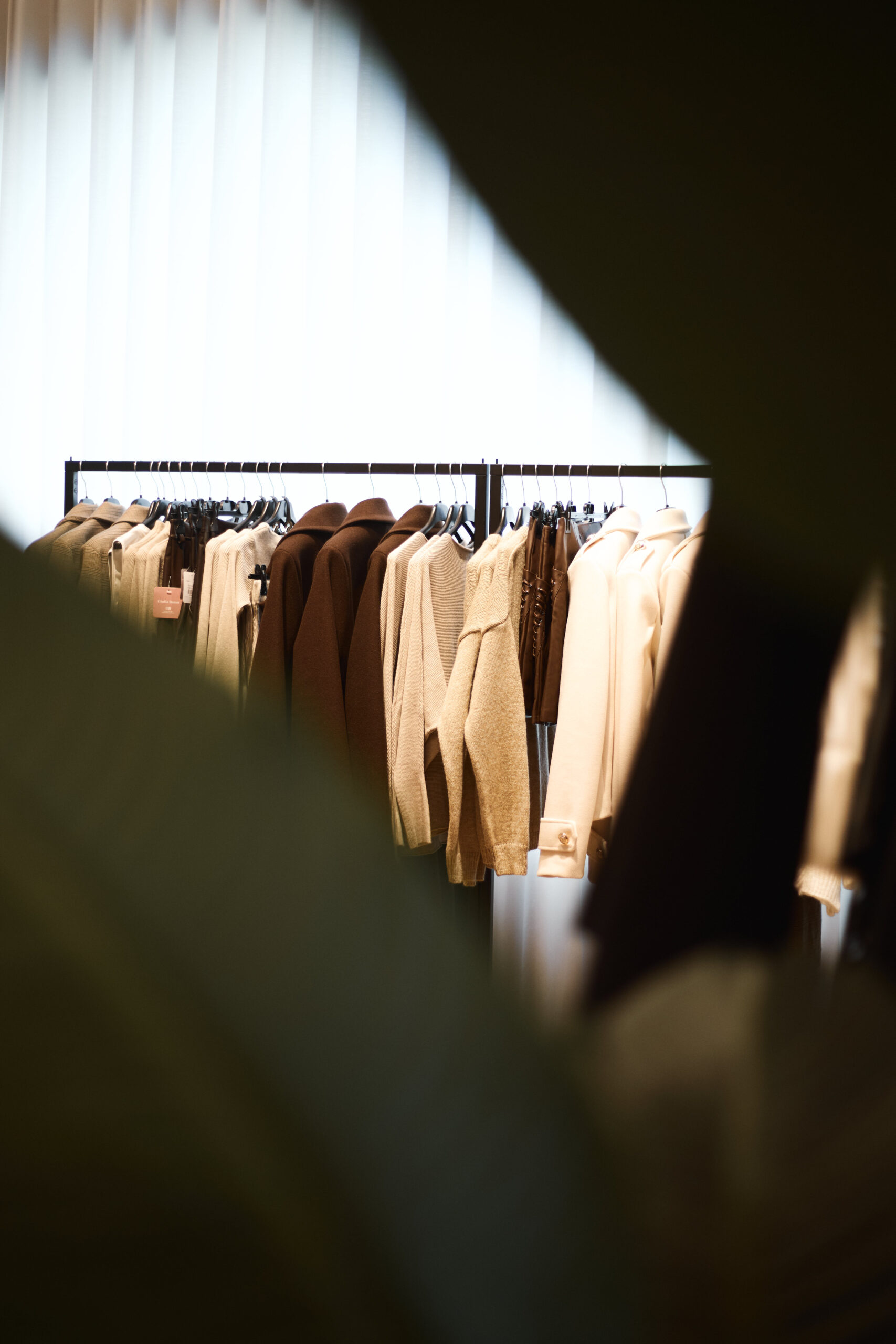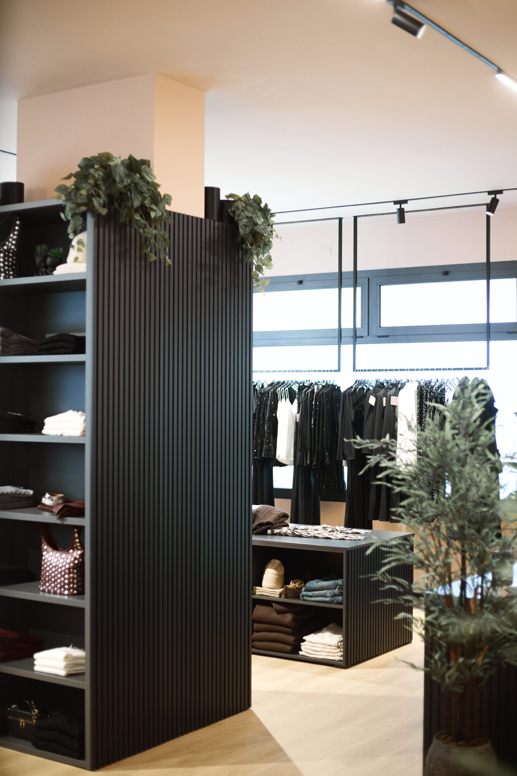 I camerini sono stati realizzati utilizzando tende custom con sviluppo tondeggiante, progettate per creare un effetto morbido e avvolgente. La tenda principale installata sulle vetrate svolge una doppia funzione: garantire la schermatura e costruire impatto dall’esterno, aumentando l’attrattività del negozio. Per il progetto illuminotecnico sono state inserite strip LED sopra i camerini per una luce uniforme e valorizzante, insieme a un sistema di illuminazione a binario interno che consente grande flessibilità nella gestione delle zone espositive.