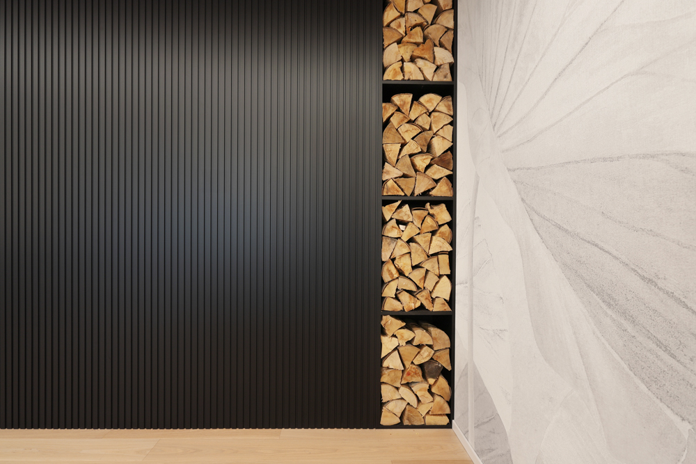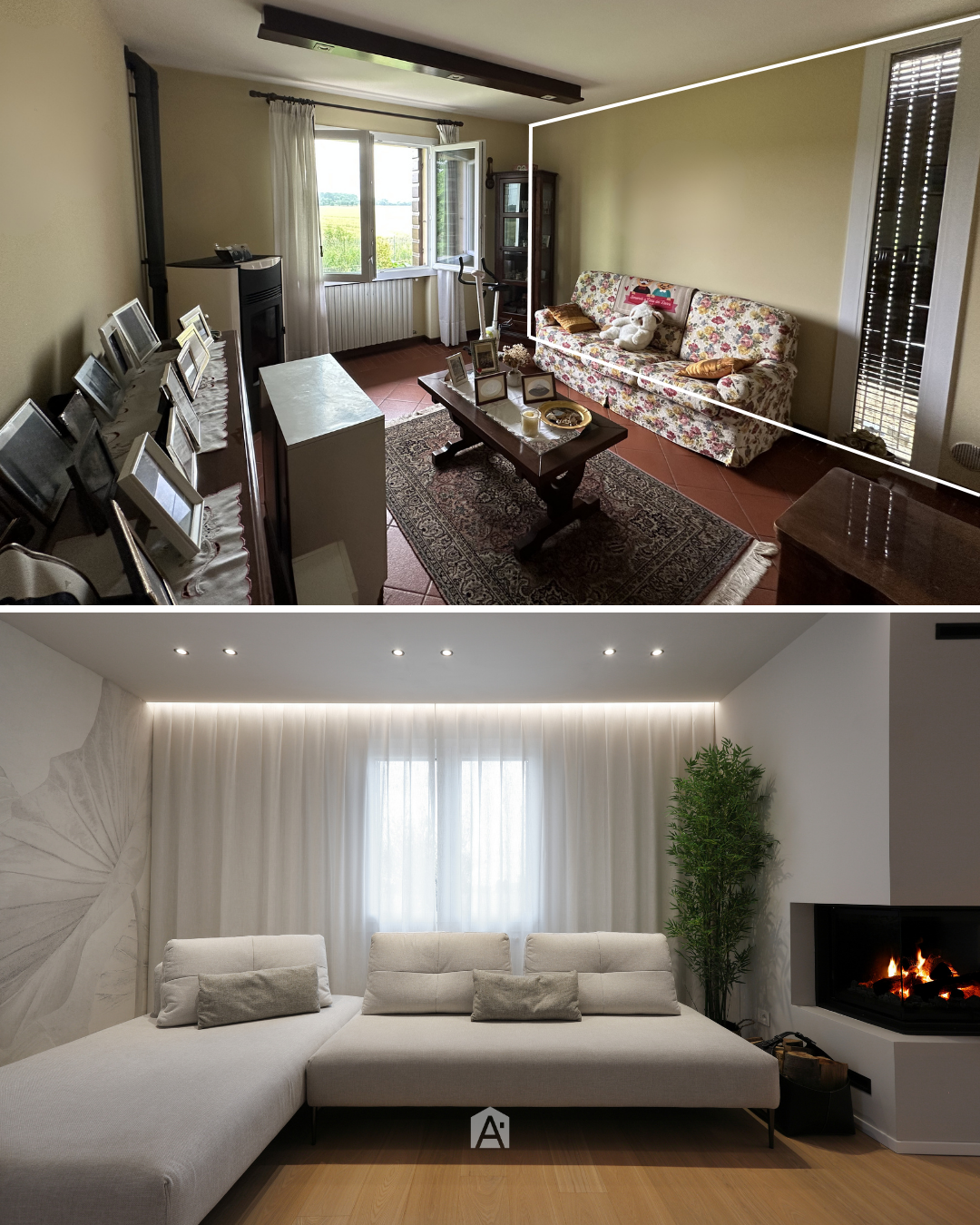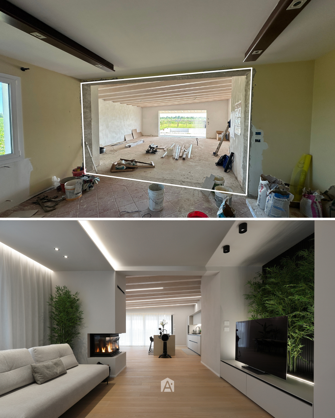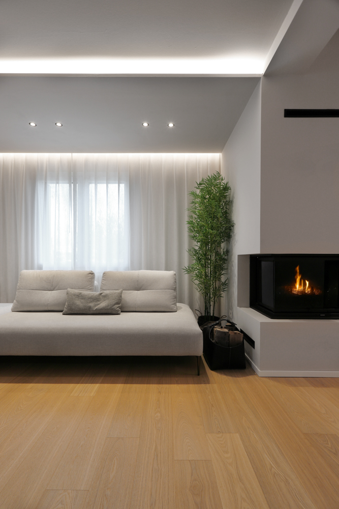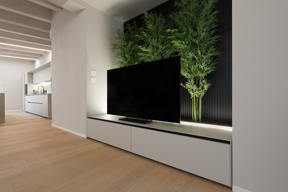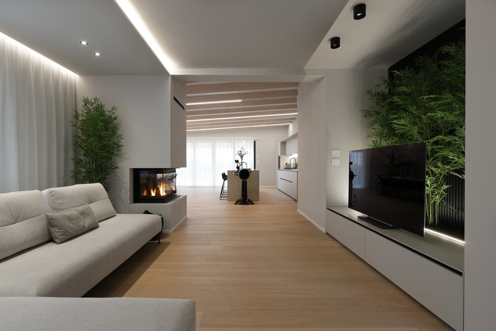L’intervento ha previsto l’ampliamento e la riorganizzazione degli spazi di una abitazione esistente, con l’obiettivo di ampliare la zona giorno e migliorare la distribuzione funzionale degli ambienti, mantenendo continuità con la struttura originaria. Elemento centrale del progetto è il caminetto a legnA, utilizzato come elemento di separazione tra zona living e cucina. Il camino è posizionato in corrispondenza della parete demolita per consentire l’ampliamento, diventando elemento di connessione tra la parte esistente e il nuovo volume. In prossimità dell’ingresso, per gestire la profondità della nicchia e la presenza di un pilastro strutturale, è stata progettata una composizione TV avanzata. Alle spalle del televisore è stato ricavato uno spazio dedicato al verde decorativo, con piante integrate che aggiungono profondità e movimento alla parete attrezzata.