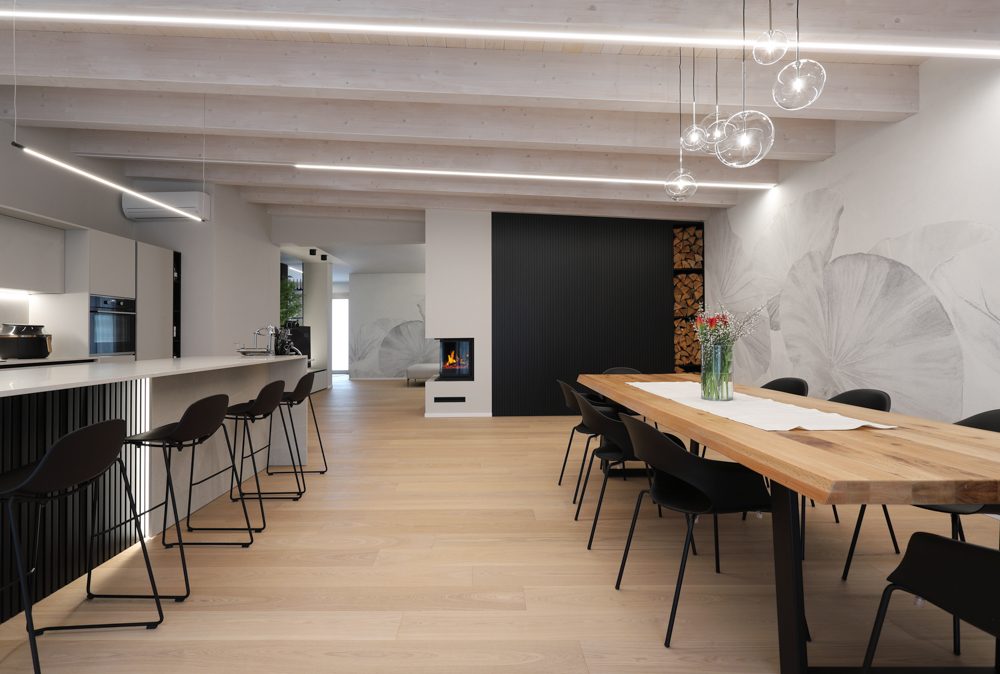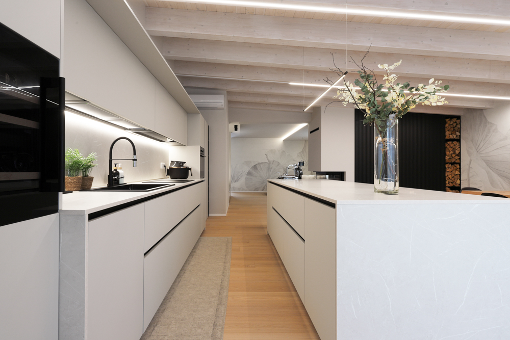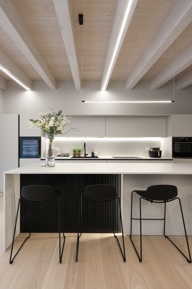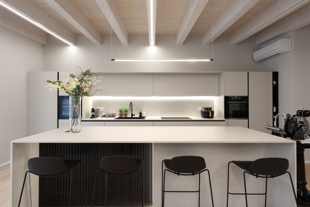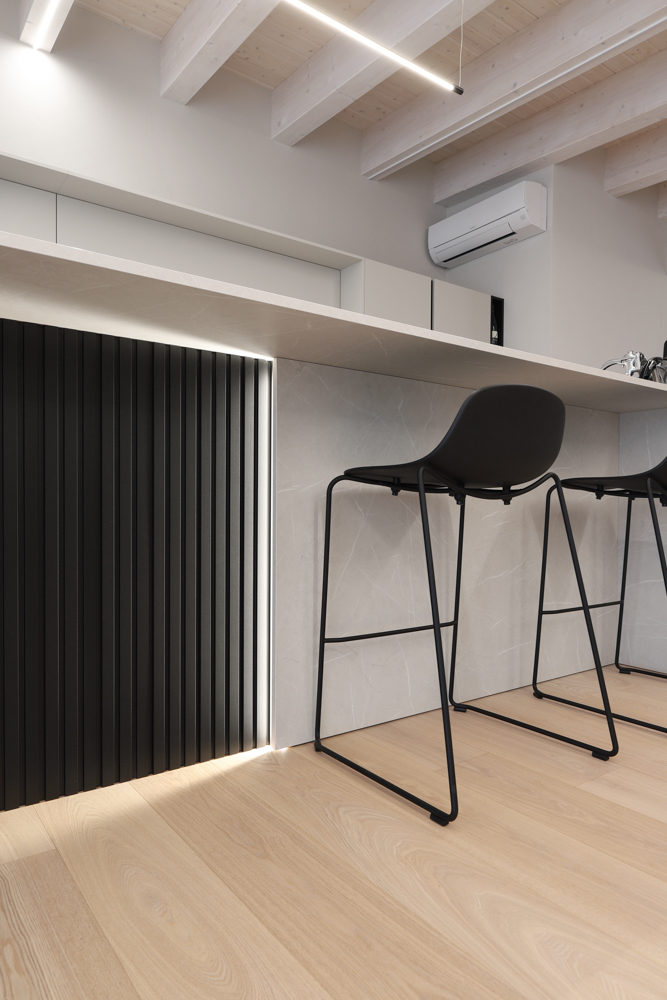 Nel progetto sono stati inoltre utilizzati elementi in canettato nero, ripresi sulla parete del caminetto, sulla parete TV e nell’isola della cucina, con l’obiettivo di creare coerenza materica tra le diverse aree funzionali. L’illuminazione è stata studiata per valorizzare la struttura esistente: strisce LED posizionate sui travi generano una luce indiretta diffusa e sottolineano l’andamento della copertura.