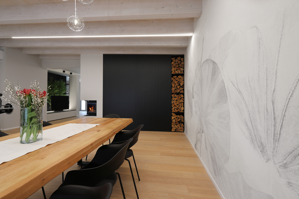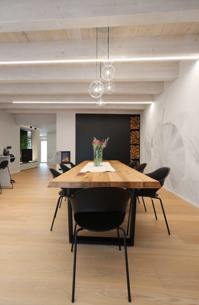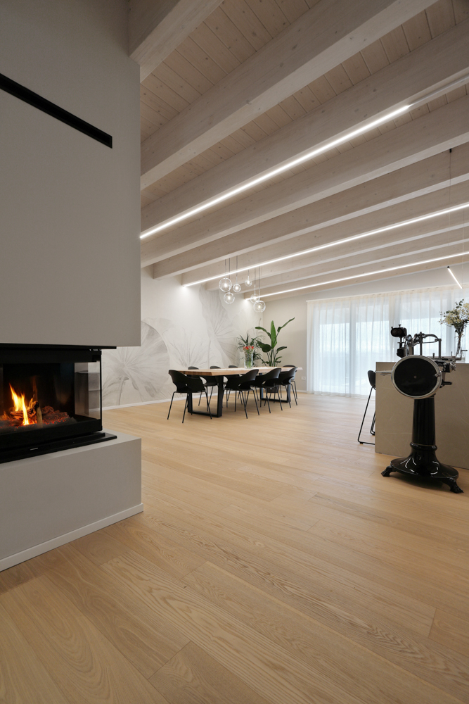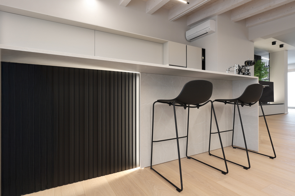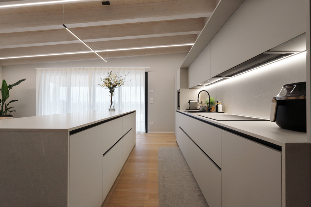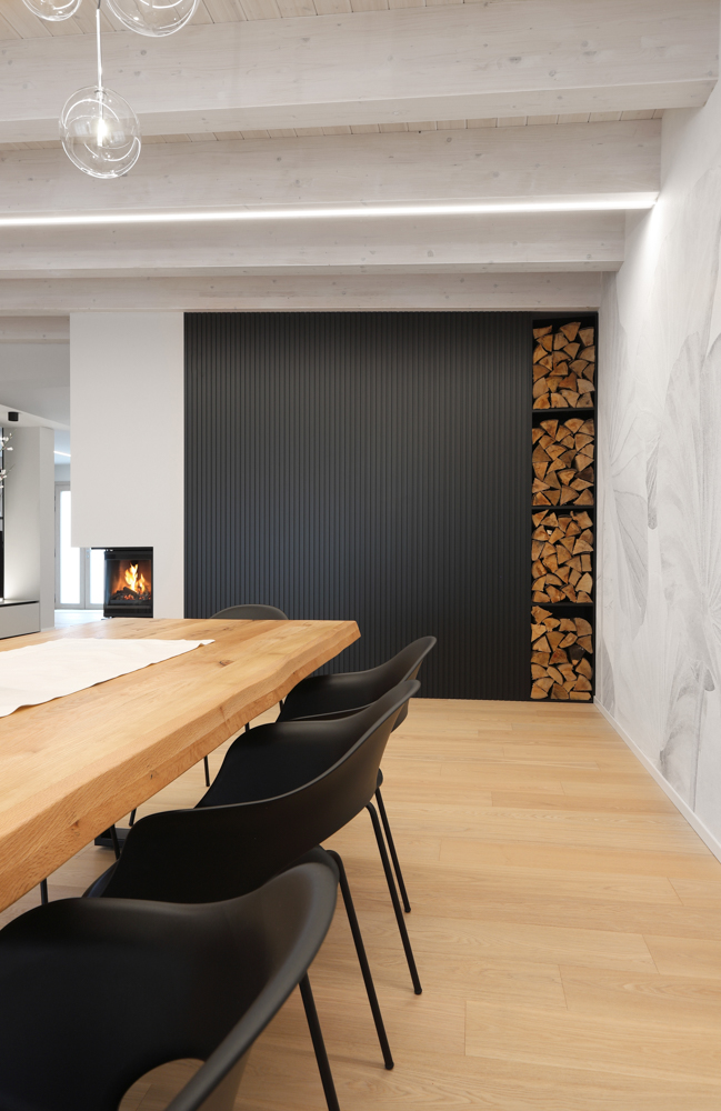 Nel progetto sono stati inoltre utilizzati elementi in canettato nero, ripresi sulla parete del caminetto, sulla parete TV e nell’isola della cucina, con l’obiettivo di creare coerenza materica tra le diverse aree funzionali. L’illuminazione è stata studiata per valorizzare la struttura esistente: strisce LED posizionate sui travi generano una luce indiretta diffusa e sottolineano l’andamento della copertura.