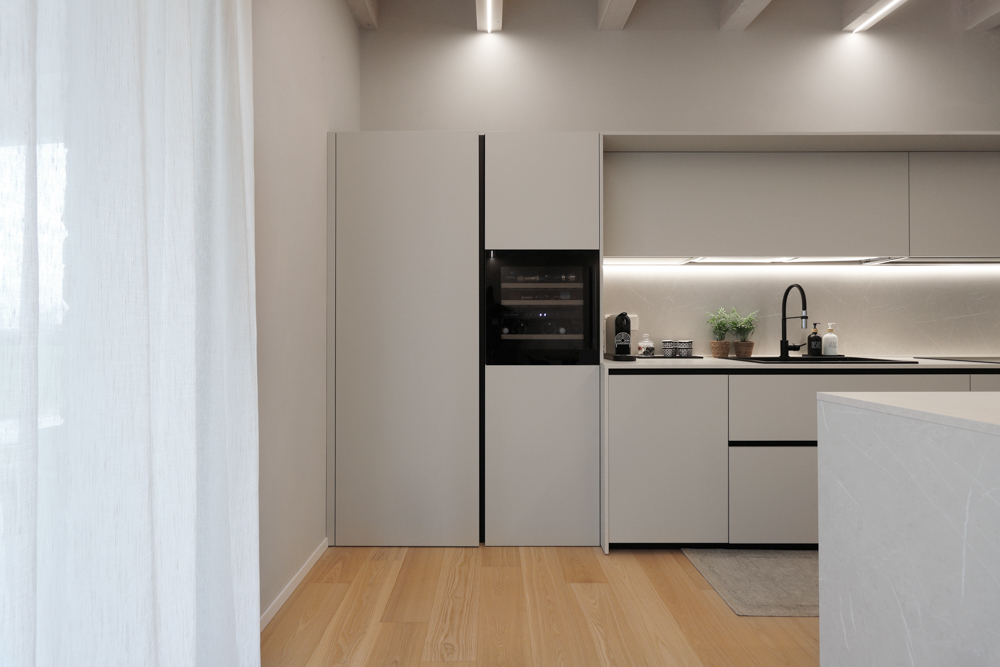 Completano l’intervento corpi illuminanti a sospensione dal design minimale sopra il tavolo e sopra l’isola della cucina, utilizzati per definire le aree funzionali della zona giorno.